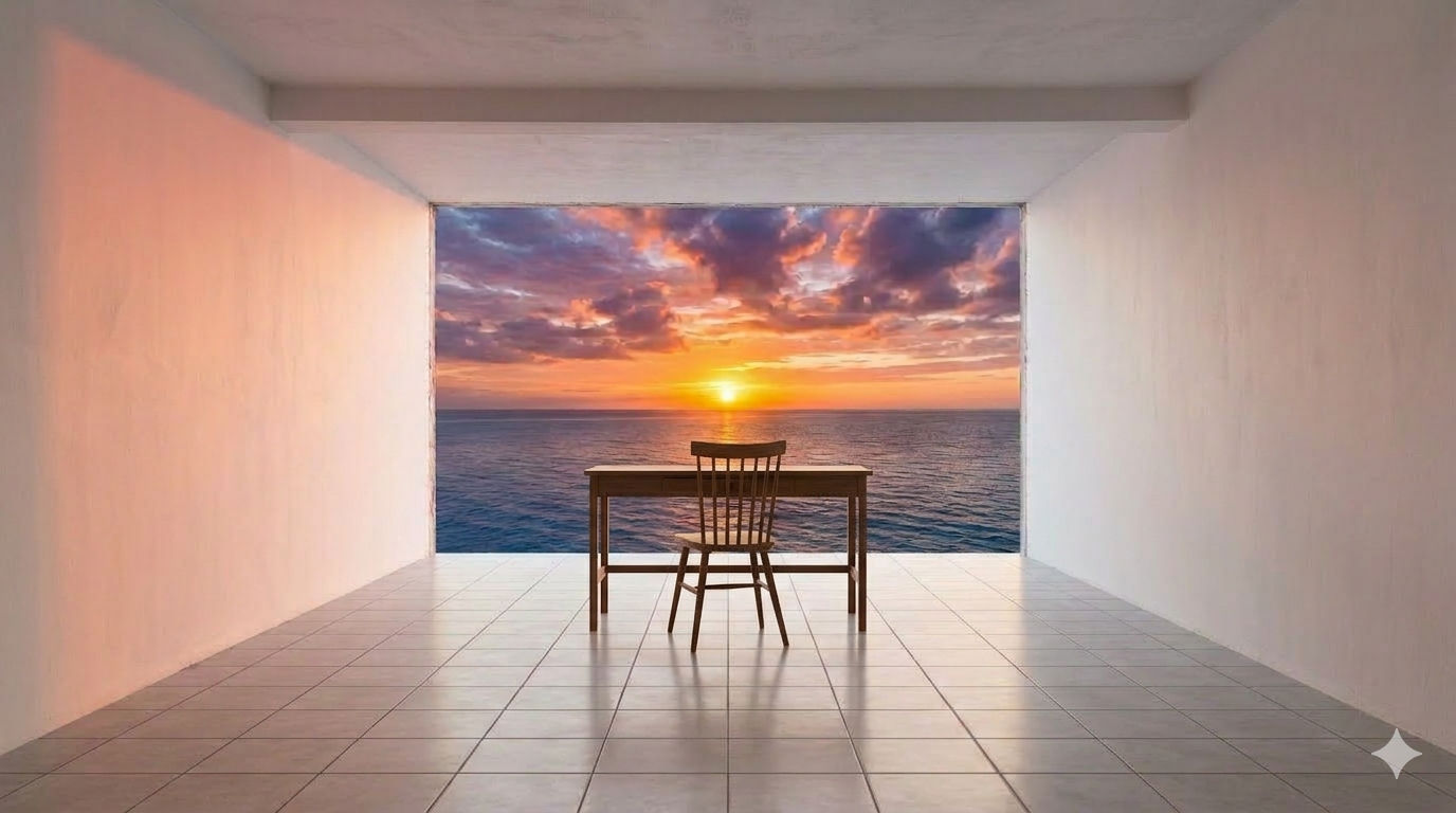You've just woken up. You're in your bed, but you're in a room you've never seen before. It's about the size of a studio apartment, with your bed against one of the walls. The entire front wall of the room is made of glass, looking out at a sunrise over an ocean. There's a writing desk in front of the glass wall. Against the back wall is Craig.